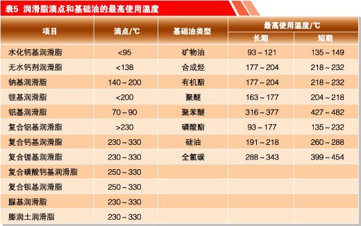 大多数润滑油在其浊点以前属于牛顿流体,在一定的压力和温度下,其运动黏度不随剪切率而改变。润滑脂则属于宾汉型塑性非牛顿流体,需要施加更多的外力才能才能使润滑脂开始进入流动状态。 由于润滑油比润滑脂具有更好的流动性和散热性,因此润滑油更适宜用于各种发动机、高速齿轮、超高速轴承的润滑,其用量远远超过润滑脂的用量。尽管如此,当遇到简化密封、减少润滑剂消耗与流失等应用情况时,就需要考虑使用润滑脂。润滑脂应用范围之所以不断扩大的另一个主要因素是密封轴承的应用越来越多。 润滑脂与润滑油之间存在着一些竞争,但在大多数情况下不能相互替代。 003)问:润滑脂主要有哪些分类及命名方式? 答:润滑脂用途广泛,很多领域都在进行润滑脂的研究和应用,这使得润滑脂的分类方式多种多样。尽管国际标准化组织专门制定了润滑脂的分类方法,但其他的分类方法仍然被广泛采用。一些润滑脂的分类及命名方法见表2。 此外,不同的公司也推出了各自的系列润滑脂。 004)问:什么是润滑脂的最佳使用温度范围? 答:润滑脂的最高或最低使用温度往往指的是极限温度。在极限温度条件下,润滑脂的性能往往与其初始性能相差很远,往往会出现润滑不足等问题,甚至出现无法满足润滑需要的情况。因此,确定一个能够满足润滑需要的润滑脂的使用温度范围十分必要。瑞典斯凯孚集团(SKF)提出了双交通灯概念,给出了低温极限、低温性能极限、高温性能极限和高温极限的定义: ◇低温极限:润滑脂允许轴承可容易地启动时的最低温度; ◇低温性能极限:在该温度极限以下,滚动元件和套圈接触表面的润滑脂供应可能不足; ◇高温性能极限:在该温度极限以上,润滑脂将以不受控制的方式发生氧化,因此将无法精确地确定润滑脂的使用寿命; ◇高温极限:当超出该温度极限时,润滑脂将永久失去其稳定结构(如皂基润滑脂的滴点)。 定义提示:润滑脂应避免在低温极限温度以下或超出高温极限温度工作,否则润滑脂将不能提供可靠的润滑,此时应标出警戒的红色;润滑脂如果在低温性能极限和高温性能极限附近的温度下工作,应标出黄色,提示此时润滑脂的使用寿命会缩短。 一些常见的矿物油型润滑脂的最佳使用温度范围见表3。 005)问:如何按使用温度范围划分润滑脂类型? 答:按使用温度划分,润滑脂大致可分为4类,即通用润滑脂、高温润滑脂、极高温润滑脂和超高温润滑脂,其具体对应的使用温度范围见表4: 006)问:选择高温润滑脂时需考虑哪些影响因素? 答:环境温度会对润滑脂的性能产生较大的影响: ◇当环境温度超过润滑脂的滴点时,润滑脂会出现严重分油、干涸甚至熔化等现象; ◇当使用温度超过一定温度后,会加速润滑脂的氧化,大大缩短润滑脂的使用寿命,或者造成润滑脂添加剂严重分解而引起腐蚀,又或者加剧添加剂与稠化剂之间的相互作用,造成润滑脂结构发生严重破坏等。 在许多情况下需要使用高温润滑脂,此时需着重考虑以下影响因素: ◇具体的环境温度和使用温度; ◇负荷和转速; ◇在使用环境中有无水、灰尘等污染物; ◇组成润滑脂的稠化剂、基础油、添加剂的热安定性和氧化安定性是否满足要求; ◇润滑脂的滴点应满足使用要求,选择膨润土润滑脂等无滴点润滑脂时应慎重考虑; ◇润滑脂的胶体安定性是否能满足要求; ◇如需更换润滑脂品种,应考虑2种润滑脂间的相容性。 007)问:如何判断润滑脂的最高使用温度? 答:一般意义上的润滑脂最高使用温度是指润滑脂的某些指标不能满足使用性能的上限温度。润滑脂的最高使用温度取决于润滑脂的基本组成,包括所用的稠化剂、基础油和添加剂。通常以润滑脂组成中或者组合后的产物中最易受到温度影响的组分来判断润滑脂的最高使用温度较为科学。 008)问:仅以滴点来判断润滑脂的最高使用温度是否可行? 答:常用的判断润滑脂最高使用温度的依据主要包括:滴点、稠化剂类型、基础油类型、添加剂类型以及加剂量等,最为科学的方法是进行综合判断。 尽管润滑脂的最高使用温度不能仅凭滴点一项指标来决定,但滴点仍是判断润滑脂最高使用温度的便捷方法之一。一般认为润滑脂的最高使用温度应低于润滑脂滴点30~50 ℃,同时可根据润滑脂的钢网分油、氧化安定性、热安定性等指标进行必要的修正。 所用基础油类型会直接影响润滑脂的最高使用温度,此时需综合考虑基础油的闪点、蒸发损失和热分解温度等指标以及润滑脂的具体性能指标要求。如果润滑脂的滴点较低,即使使用全氟碳油作为基础油,润滑脂的最高使用温度也不能高于其滴点;同样,如果采用滴点很高的膨润土润滑脂,而基础油采用矿物油,则润滑脂的最高使用温度也不宜高于矿物油的最高使用温度。 使用不同类型稠化剂的润滑脂的滴点与基础油的最高使用温度见表5: 此外,由于添加剂,特别是极压添加剂一般具有一定的化学活性,在高温下会对润滑脂的结构造成不可逆转的影响,同时也会加重腐蚀,因此加有活性较强的添加剂时,应适当降低润滑脂的最高使用温度。 009)问:润滑脂与固体润滑剂有何区别? 答:润滑脂与固体润滑剂的区别在于: ◇润滑脂通常以膏状或半流体形式存在,其中至少含有60%的液体润滑剂,同时可以添加各种添加剂,包括固体润滑剂(或填料)。 ◇固体润滑剂一般以固态形式存在,通过涂