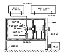 试验机置于一隔音箱中。将含油轴承试件装于轴承座中后,用弹簧在垂直方向拉紧,使拉紧负荷在4.9~14.7N(压力0.17~0.51MPa)范围内变化,轴对含油轴承旋转时轴的转数在300~400r/min(周速6~75m/min)的范围内变化。用固定在轴承座上的振动拾音器捕捉滑动音;将滑动音转换成电信号,经振动计(电测V~115T),用具有一定倍频程的滤波器的频率分析仪(电测F-63U)测定声压级。